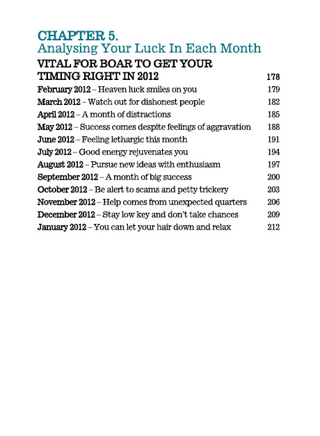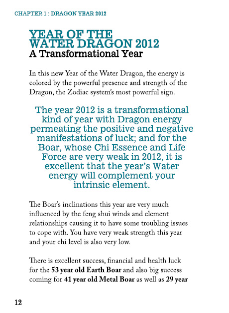 The BOAR enters the 2012 Dragon Year instantly benefiting from heavenly blessings which give you an auspicious head start into the new year. Good heaven luck provides excellent safeguards against the violent star affliction brought by the feng shui winds. The key to success in 2012 is confidence and mental resilience. Strengthen your life force with metal and your chi essence with earth; with this element re-balancing in place, nothing will be beyond you. Greater clarity of purpose is what will bring you success. READ HOW INSIDE!