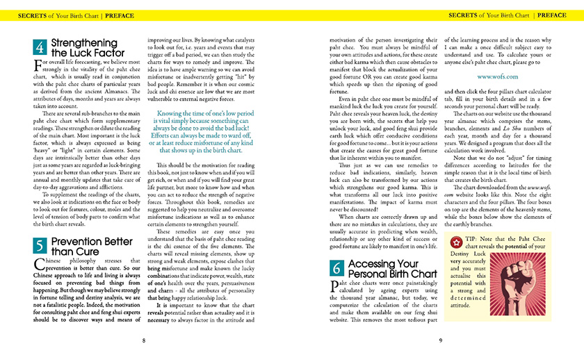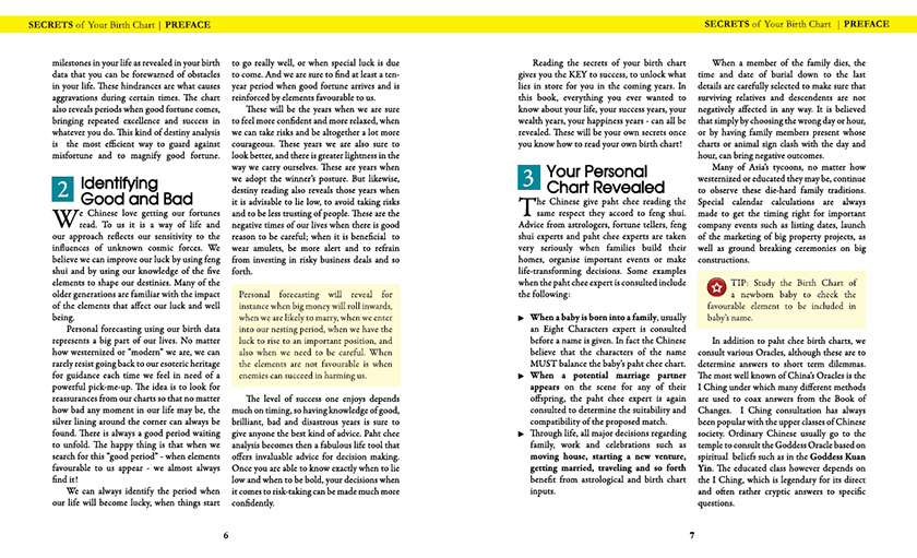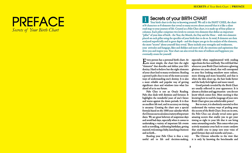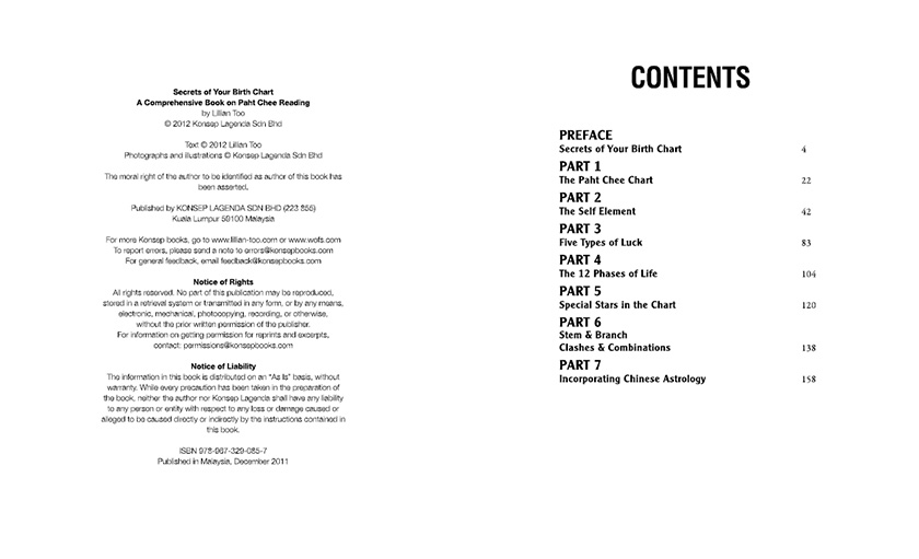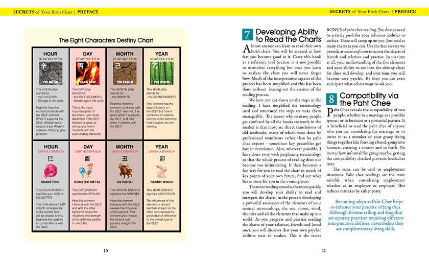 Everyone has question about their future, and here is where the art of unlocking the secret of your Chinese birth chart can reveal clear and deep insights about your destiny. In her new book "Secret of Your Birth Chart" , Lillian Too breaks down the method of reading your own Paht Chee into easy-to-follow steps, and reveals int great depth all the influences that will shape the highs and lows of your future.