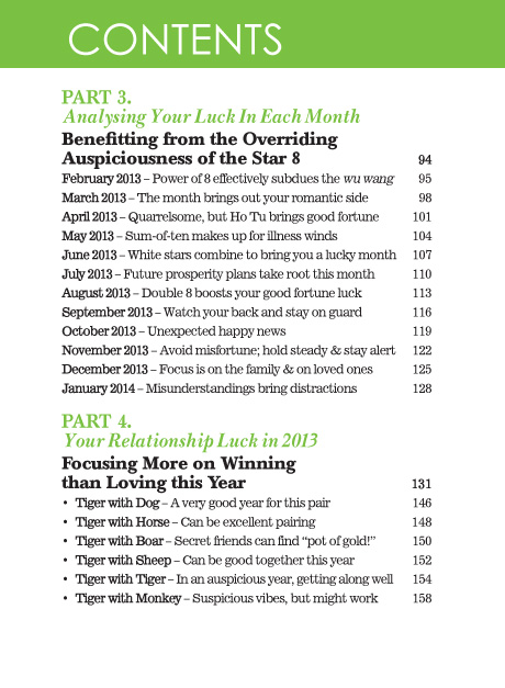The TIGER enjoys the good fortune of the incredibly auspicious star 8 in 2013. This gives an invaluable boost to your luck in a year when your vitality levels are not at their best. The star of 8 fires your enthusiasm and brings prosperity potential. You can look forward to moments of blissful happiness and general good health. Enjoy the auspicious feng shui winds. Let them help you leapfrog to new levels of attainment. Stay strong and stay inspired!