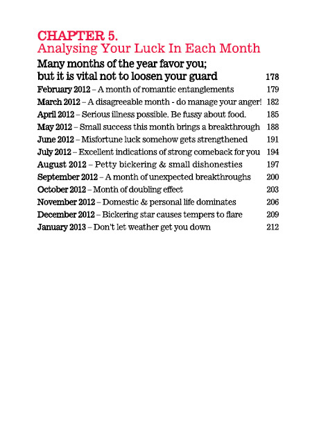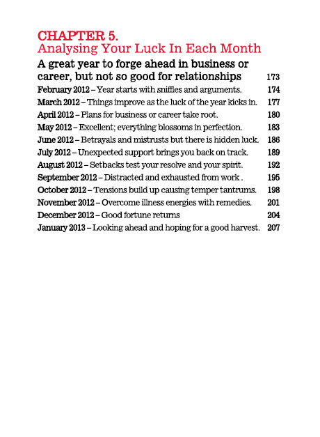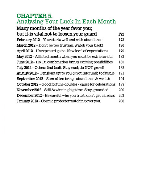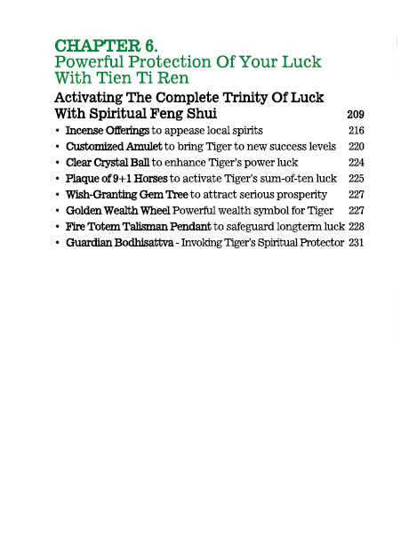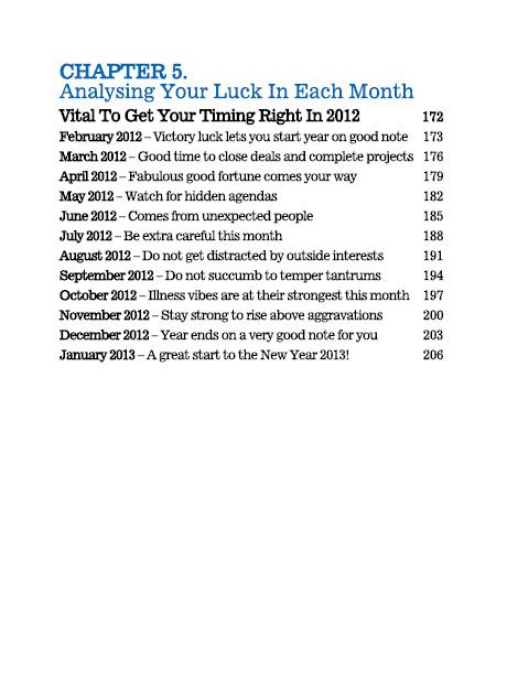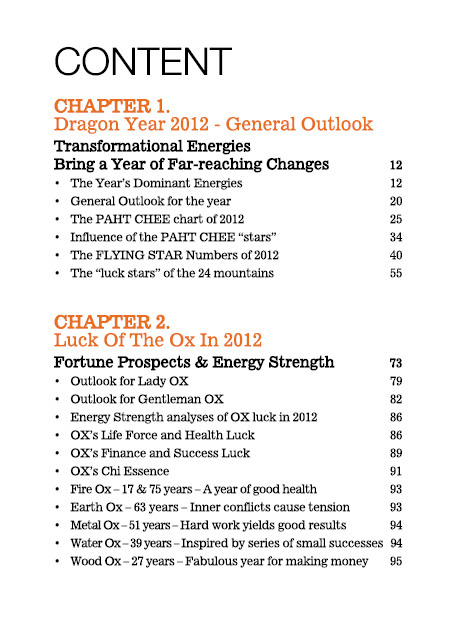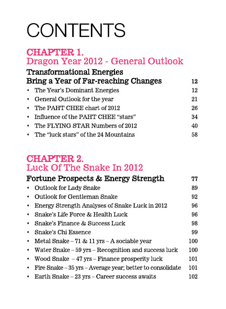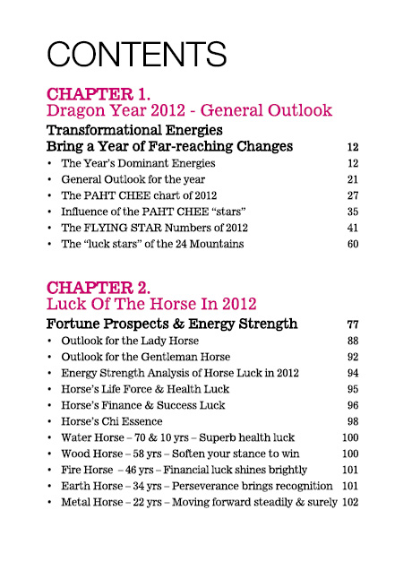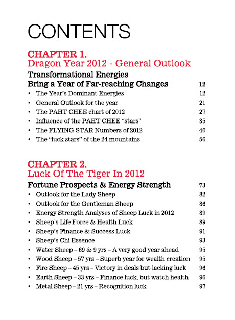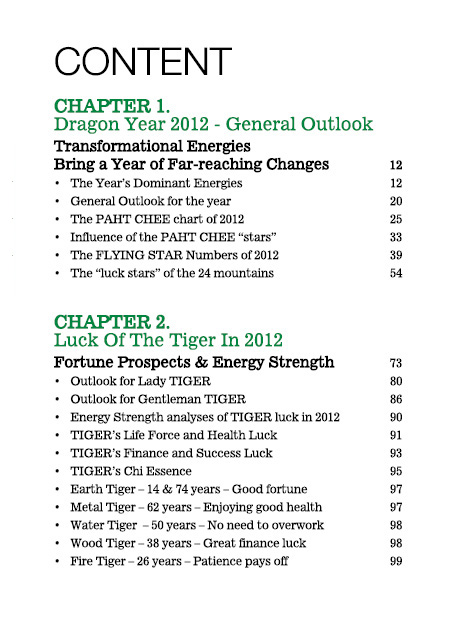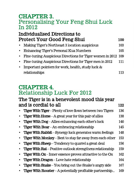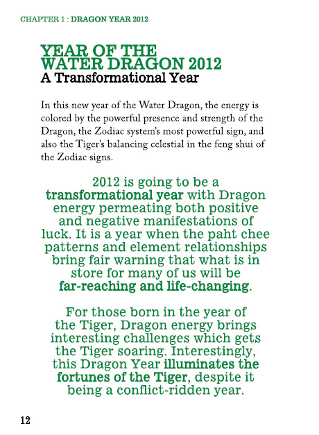The TIGER continues its spate of good luck into the Year of the Dragon 2012, still making its presence felt and still enjoying cosmic protection and great chi essence and life force strength This is a year when your wealth increases and your capital sum expands, making the future for those of you in your later years feel a great deal more secure and confident. The vital factor is to rise above the unsettled energies of the year, and focus on and benefit from the year's wealth-making opportunities. READ MORE INSIDE!